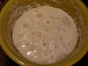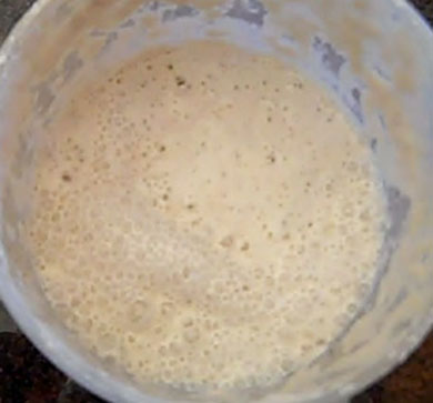 - Add 75 g of the reserved tap water and 75 g flour, whip, and leave at room temperature, covered as before, for another 24 hours, again whipping occasionally. You should see bubbles starting to form and the mixture increasing in bulk.